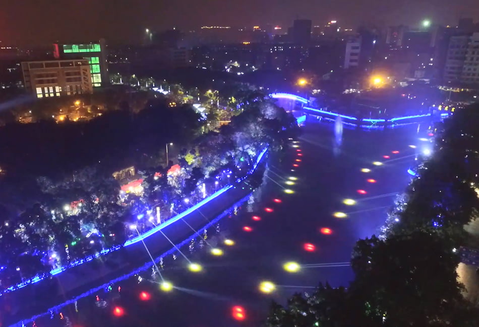 彩色汾江項目設計按照“一軸,兩帶,多點”的燈光創意理念,把規劃地段凝聚成一幅以剪紙、粵劇等佛山最具代表性的文化元素,結合現代、時尚、科技等元素,展現出一幅豐富立體的燈光巨卷。